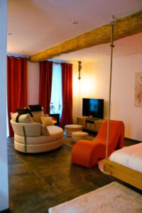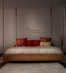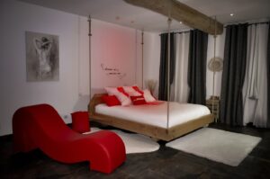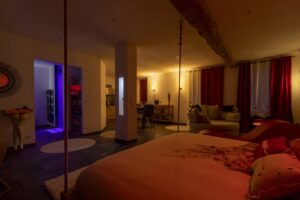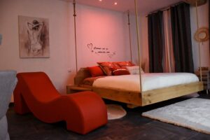 Lit King‑Size suspendu, literie premium, ambiance tamisée et décoration soignée pour éveiller les sens.